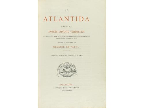 1878. LIBRO. (LITERATURA CATALANA). LA ATLANTIDA. Trad. castellana per Melcior de Palau. Barcelona: Estampa Jaime Jepús, 1878. 8º mayor. 345 p. + 1 h. Bellas cabeceras, capitales y culs-de-lampe. Papel de hilo exprofeso y con la filigrana ´Atlantida´. Bonita enc. en tela edit. estampada, rozada. Primera edición bilingüe y primera con el texto definitivo revisado y supervisado por el propio autor. Anteriormente y sin permiso se había publicado el texto dentro de la revista l'Aureneta de Buenos Aires (1877), y primeramente en los Jochs Florals, año XIX (1877).
