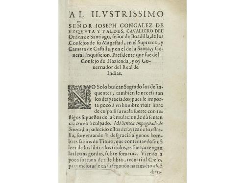 1661. LIBRO. (LITERATURA). SENECA IMPUGNADO DE SENECA EN QUESTIONES POLITICAS, Y MORALES. Madrid: Imp. de Pablo Val, 1661. 8º mayor. 15 h. + 252 p. + 13 h. (de 14, falta la última). Portada remontada y a1 remarginada. Cabeceras, capitales y culs-de-lampe xilografiadas. Texto con apostillas marginales. Enc. en pasta española, nervios, tejuelo, cortes pintados, planos rozados. CCPB 33902-4.