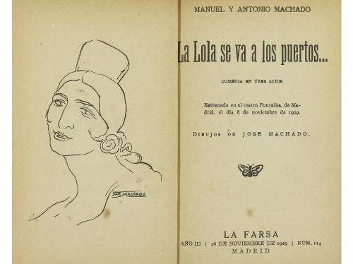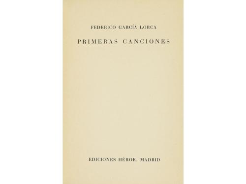 1936. LIBRO. (GENERACIÓN '27). PRIMERAS CANCIONES. Madrid: Ed. Héroe (por Concha Méndez y Manuel Altolaguirre), 1936. 8º. 31 p. + 1 h. Enc. en cartoné azul editorial rozado, sin el lomo. Primera edición. Obra muy rara en comercio, es el último libro que se publicó en vida del autor. Al principio reza: Las "Primeras Canciones" (1922), milagrosamente inéditas, pertenecen a un libro de adolescencia aún no ordenado por su autor, importantísimo para el ulterior desarrollo de su mundo poético, y se reúnen aquí, al azar, como anticipo de más extenso y representativo conjunto.