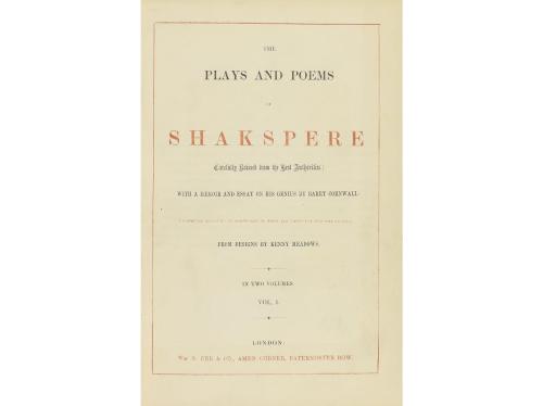 1852. LIBRO. (LITERATURA). THE PLAYS AND POEMS OF... Carefully revised from the best authorities: with memoir and essay on his genius by Barry Conrwall. London: Wm. S. Orr & Co, 1852. 2 vol. en 4º. 1440 p., con el texto a dos columnas y paginación seguida en los dos volúmenes. Profus. ilustr. en el texto y fuera del texto por Kenny Meadows, preside el primer vol. un retrato grabado del autor. Dos vol. enc. en plena piel, con escudo dorado y hierros secos en ambos planos, cortes pintados, lomos levemente rozados.