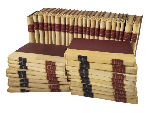 1859-1936. LIBRO. (LITERATURA CATALANA). JOCHS FLORALS. Barcelona: Imp. el Porvenir- Libr. de A. Verdaguer, Estampa la Renaixensa, 1859-1936. 79 vol. en 4º menor. Colección completa de todo lo publicado desde su restauración en 1859, sucesivos hasta 1936. Entre 100 y 160 p. cada vol. Encuadernación uniforme para todos los vol. en medio pergamino, doble tejuelo, corte superior dorado. Alguno moteado de óxido pero en general buena colección de gran presencia y conservación.