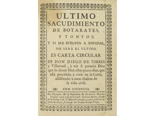 1730. LIBRO. (LITERATURA). ULTIMO SACUDIMIENTO DE BOTARATES, Y TONTOS, Y SI ME BUELVEN A ENFADAR, NO SERÀ EL ULTIMO. ES CARTA CIRCULAR DE... Madrid: Imp. Antonio Marin, 1730 (en la aprobación). 8º mayor. 4 h. + 27 h. Portada en orla xilográfica. Capitales y cabecera xilográficos. Enc. en media piel reciente. Palau 337531. CCPB 134958-9.