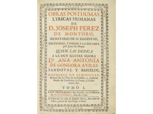 1736. LIBRO. (LITERATURA). OBRAS POSTUMAS LYRICAS HUMANAS DE... SECRETARIO DE SU MAGESTAD. Madrid: Oficina de Antonio Marin, 1732. 2 vol. en 8º mayor. I: 12 p. + 468 p. + 9 h. II:2 h. + 458 p. + 9 h. Las dos portadas a dos tintas y en orlas xilográficas. Dos vol. enc. en pergamino de época, con reparación en el lomo del primer vol. Impresión nítida sobre buen papel. Palau 221678. CCPB 58372-3 y 58373-1.
