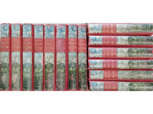 s.XIX. LIBRO. (LITERATURA). VOYAGES EXTRAORDINAIRES. LOTE DE 27 VOLÚMENES DE OBRAS DE... Todos los volúmenes editados en París en la colección HETZEL, con las telas editoriales estampadas, muchos con los cortes dorados. Todos ilustrados y en buena conservación salvo alguna tela rozada en las cabezadas o planos. Sólo tres vol. encuadernados diferente. Todas las obras en francés. Algunos de los títulos son: Les Indes Noires, Dux ans de vacances, Nord contre sud, la chasse au metheore, la maison a vapeur, un capitaine de quinze ans, cinq setmaines en ballon, voyage au centre de la terre, Clovis Dardentor, l'ile mysterieuse...