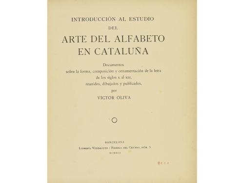 1913. LIBRO. (LINGÜÍSTICA). INTRODUCCIÓN AL ESTUDIO DEL ARTE DEL ALFABETO EN CATALUÑA. DOCUMENTOS SOBRE LA FORMA, COMPOSICIÓN Y ORNAMENTACIÓN DE LA LETRA DE ISO SIGLOS X AL XIII, REUNIDOS, DIBUJADOS Y PUBLICADOS POR... Barcelona: Libreria Verdaguer [Villanueva y Géltru, Oliva, impresor], 1913. 4º. 58 p.+ 1 lám. Profusamente ilustrado, algunos grabados a dos tintas. Encuadernado en media piel, planos levemente rozados, conserva las cubiertas originales. Libro buscado, se tiraron pocos ejemplares.