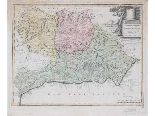 1782. MAPA. GRANADAE, CORDOVAE ET GIENENSIS REGNA. Mapa grabado al cobre, 47 x 60 cm plancha y 52 x 61 cm el papel. Ligero coloreado. Basado en los mapas de Tomás López y realizado por el cartógrafo alemán Franz Ludwig Güssefeld, en los talleres de los herederos de Homanno. Leve cerco en las esquinas superiores.