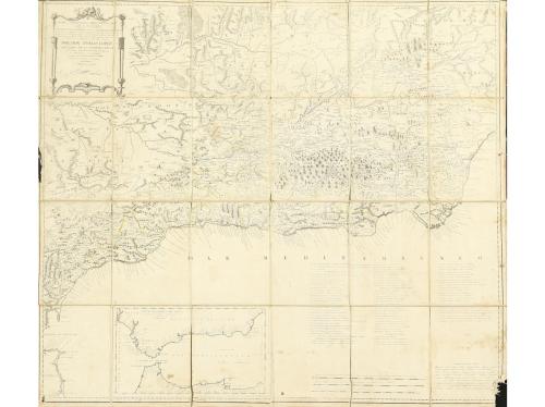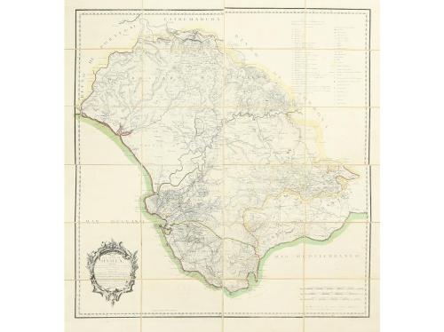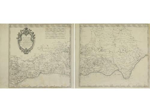 1767. MAPA. (LOTE MAPAS ANDALUCÍA). MAPA DEL REYNO DE SEVILLA. Madrid: 1767. 87 x 81 cm, entelado. Ligero coloreado. [Más:] MAPA DEL OBISPADO Y REYNO DE MURCIA DIVIDIDO EN SUS PARTIDOS. Id., 1768. 40 x 44 cm. Entelado, mancha de humedad alrededor de la cartela. [Más:] COELLO, ATLAS DE ESPAÑA. Hoja suplemento de Andalucía, plegado, algunas rasgaduras sin pérdida.