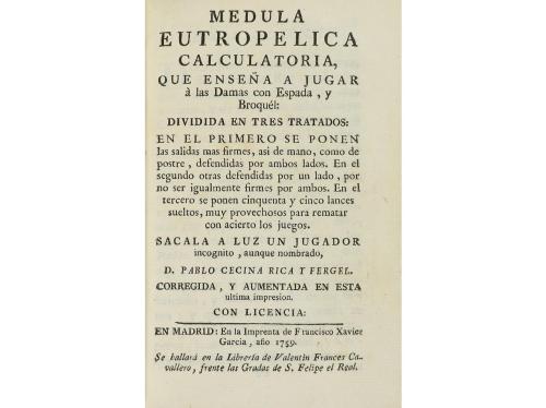 1759. LIBRO. (JUEGOS). MEDULA EUTROPELICA CALCULATORIA, QUE ENSEÑA A JUGAR A LAS DAMAS CON ESPADA Y BROQUÉL: dividida en tres tratados: en el primero se ponen las salidas mas firmes, assi de mano, como de postre, defendidas. Madrid: Francisco Xavier Garcia for Valentin Frances Cavallere, 1759. 8º menor. 8 h. + 184 p. Viñeta, capital y cules-de-lampe xilográficos. Encuadernación de época en pergamino a la romana. Palau 50862, publicada por primera vez en 1718 y reimpresa de nuevo, esta es la tercera edición.