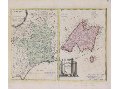 1798. MAPA. MURCIA REGNUM/ INSULARUM MALLORCA & CABRERA. Norimbergae: Homann Heredes excuderunt. 45 x 60 cm huella, y 54 x 62 cm papel. En la mitad izquierda Murcia con su cartela y en la derecha las islas de Mallorca y Cabrera con su propia cartela. Ligero coloreado de época.