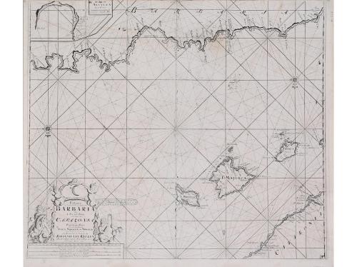 1750 ca. MAPA. (CARTA NÁUTICA). PASKAART VOOR EEN GEDEELTE DER KUST VA, BARBARIA, VAN C. IVI, TOT BONA. EN DE KUST VAN CATALONIA VAN PENISCOLA, TOT MATARO. ALS MEDE DE AYLANDEN, YVICA, MAJORCA, EN MINORCA. Amsterdam. Mapa calcográfico sobre papel verjurado con filigrana. 53 x 62 cm. Impresión algo floja. Apareció en la última edición de Van Keulen " De Nieuwe Groote Lichtende Zee-Fackel".