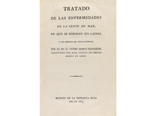 1805. LIBRO. (MEDICINA). TRATADO DE LAS ENFERMEDADES DE LA GENTE DE MAR, EN QUE SE EXPONEN SUS CAUSAS, Y LOS MEDIOS DE PRECAVERLAS. Madrid: Imp. Real, 1805. 8º mayor. XXIV + 519 p. Enc. en pasta española, nervios, tejuelo. Palau 104905, Primera edición.