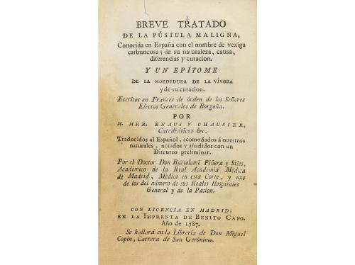 1787. LIBRO. (MEDICINA). BREVE TRATADO DE LA PÚSTULA MALIGNA, CONOCIDA EN ESPAÑA CON EL NOMBRE DE VEXIGA CARBUNCOSA; DE SU NATURALEZA, CAUSA, DIFERENCIAS Y CURACION. Madrid: Imp. Benito Cano, 1787. 8º menor. Portada + 257 p. Mancha oleosa en las primeras páginas. Enc. pasta española, cortes pintados, tejuelo, puntas y planos rozados.