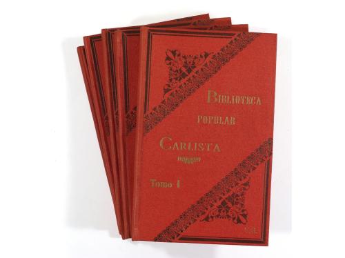 1895-1897. REVISTA. (CARLISMO). BIBLIOTECA POPULAR CARLISTA. Barcelona de julio de 1895 a diciembre de 1897. 30 vol. en 8º. Unas 80 p. c. u., con artículos de numerosos partidarios de don Carlos de Borbón. Se trataban los acontecimientos del mes y el estado de los círculos carlistas, discursos, historietas ilustradas, etc. Enc. regular en tela edit. estampada, presentados cada cinco vol. en petacas de tela, algunas petacas deterioradas, los vol. bien. Ex-libris de antiguo propietario. Publicación mensual de propaganda. Muy rara completa.