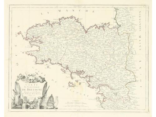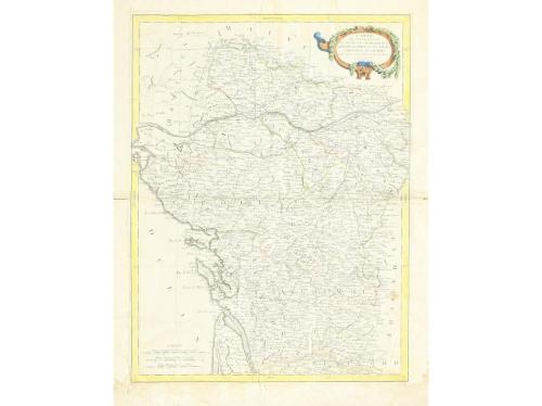 1777. MAPA. CARTE DES GOUVERNEMENTS D'ANJOU ET DU SAUMUROIS, DE LA TOURAINE, DU POTOU, DU PAYS D'AUNIS SINTONGE-ANGOUOIS. Venise: P. Santini, 1777. Grabado al cobre de 58 x 43,5 cm, papel 67,5 x 51 cm. Ligero coloreado de época. Cercos de humedad, antiguo entelado, papel algo arrugado, pero íntegro. Una década después, con la revolución, se sustituyeron las provincias por departamentos, este es un ejemplo de geografía política justo antes de ese cambio.