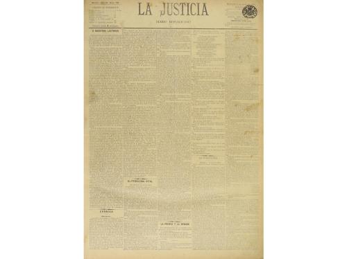 1890. REVISTA. LA JUSTICIA. DIARIO REPUBLICANO. Madrid: Imp. de la Justicia, 1890. Gran folio. Presentamos dos volúmenes: uno con con los números desde el 1 de enero de 1890 al 16 de julio del mismo año [sólo falta un número, el 2 de marzo] y otro con los números de 17 de julio a 30 de diciembre. Todos los números de 2 h. a 5 columnas. Todos llevan recortado en la segunda hoja el tercio inferior, que corresponde a la "Biblioteca de La Justicia", una publicación que aparecía impresa en el diario a fin de ir completándola. Dos vol. enc. en media tela de época, planos de cartoné, con rozaduras. Este diario intentaba unir las fuerzas de los republicanos, después de la experiencia de la Primera República, nació en 1888 en Madrid y se publicó hasta 1897.