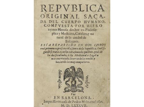1587. LIBRO. (MEDICINA-PRIMERA EDICIÓN). REPUBLICA ORIGINAL SACADA DEL CUERPO HUMANO. Barcelona: Impresso en casa de Pedro Malo, 1587. 12º. 15 h.+ 320 fol.+ 9 h. Grabado xilográfico en la portada, capitales xilográficas. Texto con apostillas, marginales y alguna antigua anotación manuscrita. Enc. en pasta española, del s. VIII, tejuelo, dorados en la lomera, cortes pintados. Pequeña falta en la parte inferior del lomo. PRIMERA EDICIÓN, muy rara en comercio. Se volvió a imprimir en 1595 pero también es rara. Palau 165882. CCPB 17709-1.