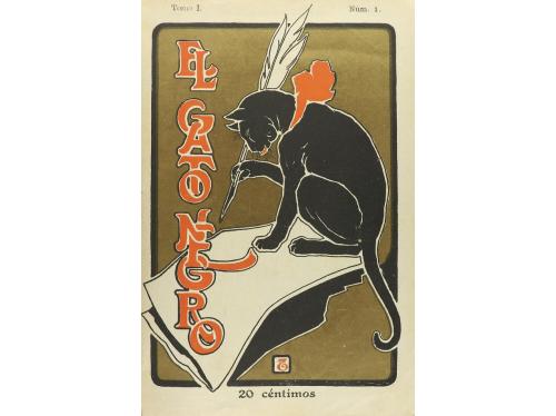 1898-1899. REVISTA. (MODERNISMO). EL GATO NEGRO. SEMANARIO ILUSTRADO. Barcelona: Tobella, Costa y Piñol impresores, 1898-1899. 2 vol. en 4º mayor. Se presenta la publicación completa encuadernada en dos vol. En el volumen I, 24 números (de 15 de enero a 25 de junio), en el segundo volumen los tomos II y III con 27 números, del 2 de julio al 31 de diciembre, y el número 1 del 7 de enero de 1899. La mayoría conservan las cubiertas originales. Encuadernados en tela editorial estampada. Frágil, con numerosas rasgaduras marginales y en algún caso pérdida de parte de alguna hoja. Revista literaria, y de actualidad, en la segunda parte del año 1898 muy centrada en la guerra con Cuba. Preferible examinar.