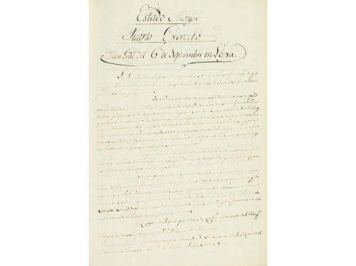 1813. LIBRO. (MILITARIA). ESTADO MAYOR. QUARTO EXÉRCITO. ÓRDENES GENERALES PERTENECIENTES À LOS MESES DE SETIEMBRE, OCTUBRE, NOVIEMBRE Y DICIEMBRE DE 1812. S. l.: Imprenta del Estado Mayor, [1813]. Folio menor. Documento mixto que se presenta ordenado por los meses que indica el título pero manuscrito e impreso. Todas las órdenes de los días 7 a 20 de septiembre están manuscritas, las órdenes del 21 de septiembre están impresas, días 22 y 23 manuscritas y los días 24 a 27 impresos, el día 28 manuscrita y los dos días restantes impresos. En el mes de octubre el día 1 está manuscrito y el resto hasta el día 16 impresos, sigue el día 17, 18 y 22 manuscritos y el resto de los días del mes impresos. Estos dos meses las órdenes, tanto manuscritas como impresas, van firmadas por el brigadier Felipe Montes. Siguen las órdenes de noviembre y diciembre todas impresas y firmadas por el brigadier Francisco Ferráz o el ayudante Gefe (sic.) Interino Agustin Otermin. Incluye al final un índice manuscrito de 4 h. con el resumen de las órdenes contenidas. Enc. en pasta española, tejuelo en el plano anterior, a dos colores cortes pintados. Casi todas las órdenes dadas desde poblaciones andaluzas (Linares, Granada, Jaen, etc.) .