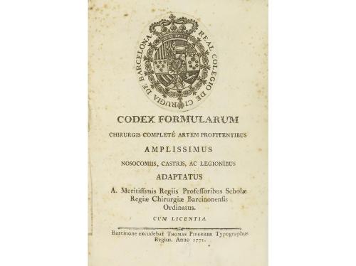1771. LIBRO. (MEDICINA). CODEX FORMULARUM CHIRURGIS COMPLETÈ ATEM PROFITENTIBUS AMPLISSIMUS NOSOCOMIIS, CASTRIS, AC LEGIONIBUS ADAPTATUS... Barcinone: Thomas Piferrer, 1771 . 8º mayor. 2 h. + 67 p. + 7 h. [Sigue:] AVISOS SOBRE EL METHODO DE RECETAR, EN QUE SE CONTIENEN LAS REGLAS MAS SEGURAS, PARA QUE LOS JOVENES FACULTATIVOS SEPAN DISPONER CON ACIERTO RECETAS... Id. 1769. 8º mayor. 126 p. Señal de óxido. Dos obras enc. juntas en un vol. en media piel, cortes jaspeados, planos de cartoné levemente rozados.