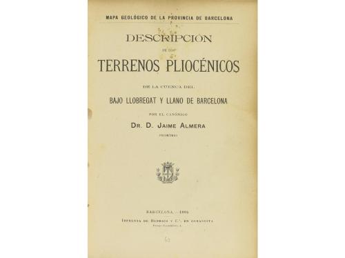 1894. LIBRO. (GEOGRAFÍA). DESCRIPCION DE LOS TERRENOS PLIOCÉNICOS DE LA CUENCA DEL BAJO LLOBREGAT Y LLANO DE BARCELONA. Barcelona: Imp. Henrich y Cª, 1894. 4º menor. 355 p. + 1 h. + XXXIX p. + 3 lám. marcadas de A a D y XXIV numeradas + 1 vista a doble página, de la Barcelona pliocénica. Estos en el texto. Papel algo ácido. Enc. en media piel de época.