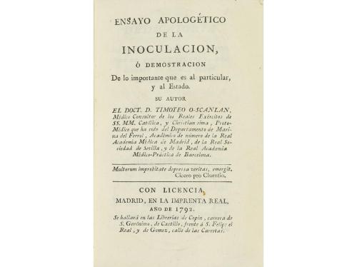 1792. LIBRO. (MEDICINA). ENSAYO APOLOGÉTICO DE LA INOCULACION, Ó DEMOSTRACION DE LO IMPORTANTE QUE ES AL PARTICULAR, Y AL ESTADO. Madrid: Imp. Real, 1792. 8º menor. 2 h. + XCVIII + 391 p. Verso de la portadilla grabado. Enc. en pasta española, tejuelo, cortes pintados. CCPB 186540-4 .
