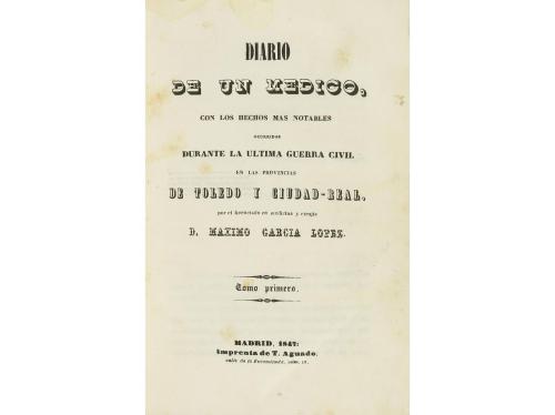 1847. LIBRO. (MEDICINA-HISTORIA). DIARIO DE UN MEDICO, CON LOS HECHOS MAS NOTABLES OCURRIDOS DURANTE LA ULTIMA GUERRA CIVIL EN LAS PROVINCIAS DE TOLEDO Y CIUDAD-REAL. Madrid: Imp. R. Aguado, 1847. 8º. 287 p. + 3 h. y 380 p. + 2 h. Ligera señal de óxido. Dos partes enc. en un vol. en media piel, planos de cartoné. CCPB 248800-0. Palau 99217, dice que es obra escasa.