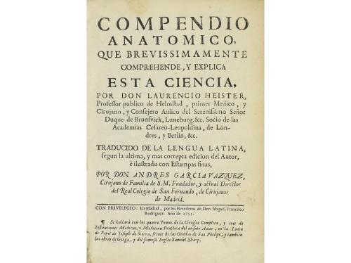 1755. LIBRO. (MEDICINA). COMPENDIO ANATOMICO, QUE BREVISSIMAMENTE COMPREHENDE, Y EXPLICA ESTA CIENCIA... Trad. Andres Garcia Vazquez. Madrid: Herederos de Don Miguel Francisco, 1755. 8º mayor. 12 h. + 318 p. + 8 h. y 7 lám. grabadas plegadas. Enc. en pergamino de época.