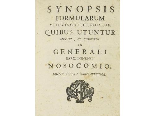 1749. LIBRO. (MEDICINA). SYNOPSIS FORMULARUM MEDICARUM, QUIBUS UTUNTUR MEDICI IN GENERALI BARCINONESI NOSOCOMIO... Barcinone: Officina Josephi Altes, 1749. 8º mayor. 12 h. + 118 p. Cabeceras y capitales xilográficas. Señal de óxido. Enc. en pergamino de época, lomera rotulada.
