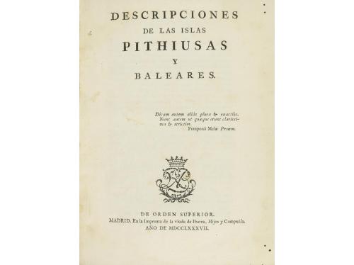 1787. LIBRO. (BALEARES). DESCRIPCIONES DE LAS ISLAS PITHIUSAS Y BALEARES. Madrid: Imp. viuda de Ibarra, Hijos y Compañía, 1787. 8º mayor. 1 h. + XXIV p. 1 h. + 158 p. + 3 estados plegados. Finos taladros marginales. Buen papel pero algún cerco sucio de humedad. Enc. en plena piel, tejuelo, planos y cantos muy rozados. Palau 253513.