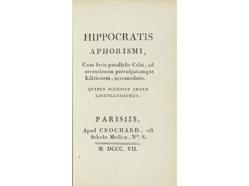 1807. LIBRO. (MEDICINA). APHORISMI, CUM LOCIS PARALLELIS CELSI, AD RECENTIOREM PERVULGATAMQUE EDITIONEM... Parisiis: Apud Crochard, 1807. 12º. 2 h. + III + 357 p. Enc. en plena piel, hilos dorados, tejuelo, lomera craquelada, cortes dorados, puntas rozadas.