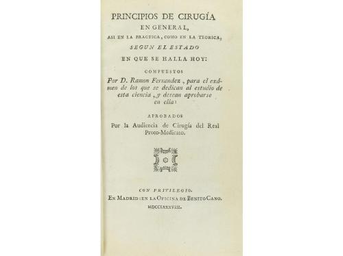 1788. LIBRO. (MEDICINA). PRINCIPIOS DE CIRUGÍA EN GENERAL, ASI EN LA PRACTICA, COMO EN LA TEORICA, SEGUN EL ESTADO EN QUE SE HALLA HOY... Madrid: En la oficina de Benito Cano, 1788. 8º. 8 h. + 489 p. Enc. en plena piel chagrín, ruedas doradas en ambos planos, lomera cuajada, tejuelo con pequeña falta, cortes dorados.