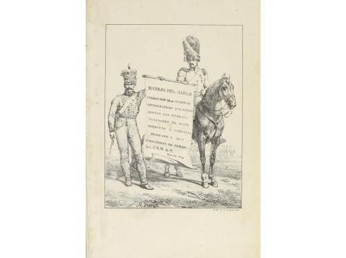 1819. LIBRO. (MILITARIA-ESGRIMA). MANEJO DEL SABLE. COLECCION DE 40 DISEÑOS LITHOGRAFICOS QUE REPRESENTAN LAS DIVERSAS POSICIONES DE ESTE EXERCICIO A CABALLO, DEDICADO A SUS COMPAÑEROS DE ARMAS POR J. V. M. de P. S. l. (Cádiz o París) : Lithografia de G. Engelman, 1819. Portada + 40 h. Todo litografiado en b/n. En la portada en plancha firma del ilustrador H. Vernet. Enc. en media piel de época, cartoné de los planos con cantos rozados. Litografías limpias en general, con algún punto ocasional de óxido. Primera edición de una de las primeras obras donde se ilustran los uniformes según los reglamentos para la caballería de 1815 y 1818. Hay representaciones de uniformes de húsares y cazadores con las pellizas, y dólmanes con trencillas, etc. CCPB 1004809-X, sólo da referencia de dos ejemplares en España. Palau 148384. Poco frecuente.