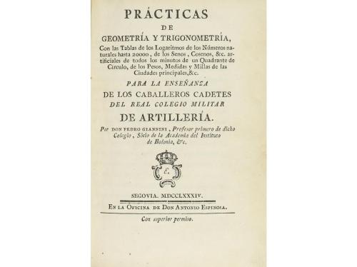 1784. LIBRO. (MILITARIA-MATEMÁTICAS). PRÁCTICAS DE GEOMETRÍA Y TRIGONOMETRÍA, CON LAS TABLAS DE LOS LOGARITMOS DE LOS NÚMEROS NATURALES HASTA 20000, DE LOS SENOS, COSENOS, &c. ARTIFICIALES DE TODOS LOS minutos de un quadrante de círculo.. Segovia: Oficina de Don Antonio Espinosa, 1784. 8º mayor. 4 h. + 199 p. + XXI lám. plegadas grabadas y 124 h. con las tablas. Enc. en plena piel chagrín burdeos, con ruedas doradas y escudo de Carlos III a modo de superlibris, en ambos planos, nervios, tejuelo, lomera cuajada, cortes dorados y guardas originales de seda. CCPB 273559-8. Palau 101786, cita cinco vol. aunque en realidad son ediciones diferentes, de las que esta es la última y más completa.