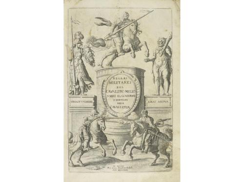 1619. LIBRO. (MILITARIA-CABALLERÍA). REGLAS MILITARES DEL CAVALLERO MELZO SOBRE EL GOVIERNO Y SERVICIO PARTICULAR DE LA CAVALLERIA. Traducidas del italiano en español por el Dr. Galderico Gali. Milan: por Iuan Baptista Bidelo, 1619. 4º mayor. Frontis grabado + portada + 6 h. + 128 p. + 14 lám. (de 16) al cobre, plegadas o a doble página. Cabecera, capitales y culs-de-lampe al cobre y capitales xilográficas. Frontis grabado al cobre con escenas alegórico-militares. Faltan las láminas 9 y 10 (se incluye una reproducción fotográfica). Cerco sucio de humedad en las primeras hojas y algunas láminas. Alguna anotación a lápiz, o antigua en tinta. Alguna antigua restauración en las láminas (refuerzos pero sin pérdida), y las láminas plegadas (especialmente 11, 14 y 15) débiles. Enc. en pergamino de epoca.