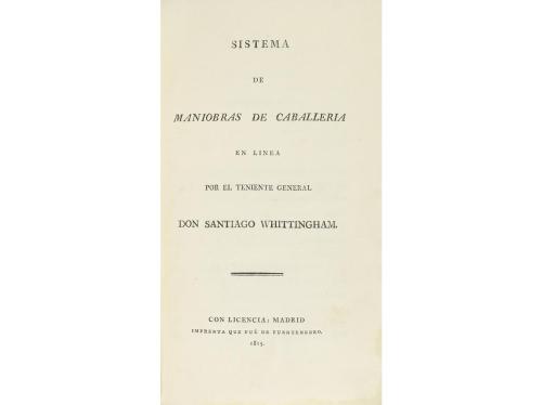1815. LIBRO. (MILITARIA-CABALLERÍA). SISTEMA DE MANIOBRAS DE CABALLERIA EN LINEA POR EL TENIENTE GENERAL... Madrid: Imprenta que fué e Fuentenebro, 1815. 4º menor, estrecho. 77 p. + XXVII lám. plegadas y coloreadas con las posiciones correspondientes en el campo de batalla. Enc. de época en plena piel, hilos dorados y cejas, tejuelo, lomera cuajada, corte rectangular en el plano anterior, probablemente para retirar el nombre de un antiguo propietario de la obra. Papel muy limpio en general. CCPB 796114-6. Palau 375089.