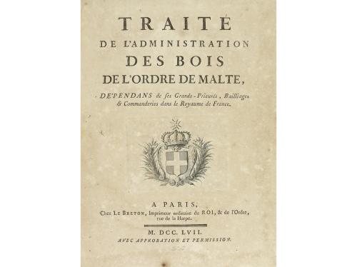 1757. LIBRO. (ORDEN DE MALTA). TRAITÉ DE L'ADMINISTRATION DES BOIS DE L'ORDRE DE MALTE, DE'PENDANS DE SES GRANDS-PRIEURÉS... Paris: Chez Le Breton, 1757. 4º. XIII p. + 1 h. + 235 p. [sigue:] MODELES DES ACTES CONCERNANT L'ADMINISTRATION DES BOIS... 51 p. Texto con apostillas marginales. Capitales, cabeceras y culs-de-lampe xilográficos. Enc. en pasta epañola, nervios, tejuelo, lomera cuajada, cortes pintados. Edición única de este texto atribuido a Givaudan. Recoge la ordenanza de 1669 sobre los bosques pertenecientes al clero, y el decreto del gran Maestre de 1648, también sobre la vigilancia de los bosques.