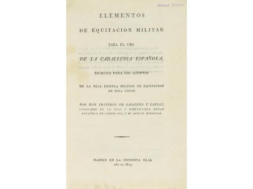 1819. LIBRO. (MILITARIA-EQUITACIÓN). ELEMENTOS DE EQUITACION MILITAR PARA EL USO DE LA CABALLERIA ESPAÑOLA. Madrid: Imp. Real, 1819. 3 partes en 1 vol. en 8º mayor. 224 p.+ 3 h.+ 13 lám. grabadas al cobre varias coloreadas a mano de época. Enc. en plena piel, tejuelo, cortes pintados. Ex-libris.
