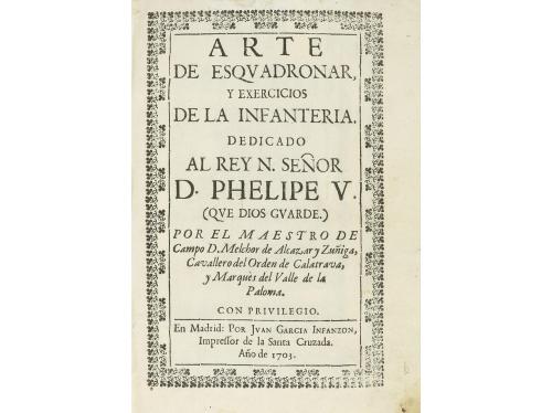 1703. LIBRO. (MILITARIA.INFANTERÍA). ARTE DE ESQUADRONAR, Y EXERCICIOS DE LA INFANTERIA. DEDICADO AL REY N. SEÑOR D. PHELIPE V. Madrid: Por Juan Garcia Infanzon, 1703. 8º mayor. 10 h. + 210 p. + 55 lám. (casi todas plegadas) + 1 h. de índice (de 2). Ejemplar muy usado y manoseado, una lámina con pequeña falta marginal que afecta levemente el grabado. Enc. en plena piel, hilos dorados en ambos planos, cabezada inferior restaurada y a la vista. Marca de antiguo propietario en la hoja de guarda. CCPB 347838-6. Palau 6027.