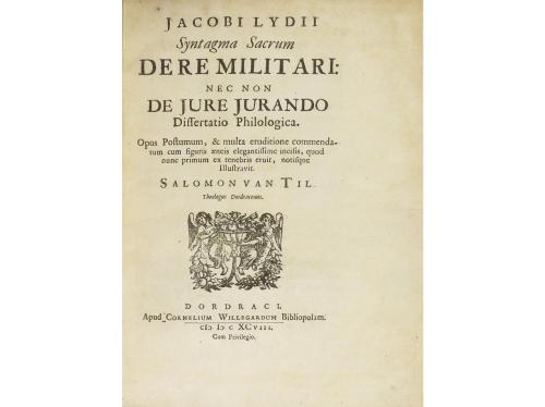 1698. LIBRO. (MILITARIA). SYNTAGMA SACRUM DE RE MILITARI: NEC NON DE JURE JURANDO DISSERTATIO PHILOLOGICA. Dordraci [Dordrecht]: Apud Cornelium Willegardum Bibliopolam, 1698. 4º menor. Frontis grabado + 13 h.+ 338 p. + 56 p. + 14 h. Ilustr. con 12 lám., fuera del texto y 4 de ellas plegadas, grabadas al cobre. Ilustr. con cabeceras, capitales y culs-de-lamp. Enc. en media piel reciente, nervios, tejuelo. Ex-libris. Las ediciones del impresor Willegardum son muy apreciadas por la gran calidad y belleza de sus grabados.
