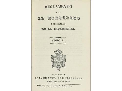 1837. LIBRO. (MILITARIA-INFANTERÍA). REGLAMENTO PARA EL EJERCICIO Y MANIOBRAS DE LA INFANTERIA. Madrid: Imprenta de D. Pedro Sanz, 1837. 2 vol. en 8º menor. I: 3 h. + 383 p. + 37 lám. plegadas numeradas (faltan la 38 y 39) más 3 sin numerar, algunas coloreadas de época. II: 1 h. + 217 p. + de lám. 40 a 77, plegadas, fuera de texto. 2 vol. enc. en pasta española, tejuelo, planos rozados. Ex-libris.