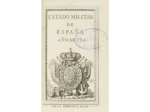 1794. LIBRO. (MILITARIA). ESTADO MILITAR DE ESPAÑA AÑO DE 1794. Madrid: Imp. Real. 8º menor. Portada grabada por Carmona + 372 p. Todo el texto en orla decorativa. Sello de caucho en la portada. Enc. en plena piel chargrín, con ruedas doradas en ambos planos, cantos, lomera cuajada, cortes dorados .