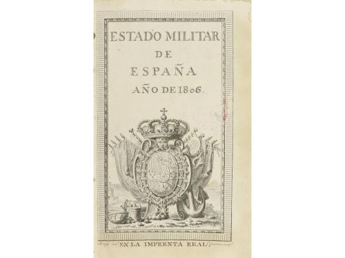 1806-1807. LIBRO. (MILITARIA). ESTADO MILITAR DE ESPAÑA, AÑO DE 1806. Madrid: Imp. Real, 1806. Portada grabada por Carmona + 495 p. Todo el texto en orla decorativa. Enc. en plena piel chagrín rojo, con ruedas doradas en ambos planos, cortes dorados, lomera cuajada con algún taladro. [Sigue:] ESTADO MILITAR DE ESPAÑA, AÑO DE 1807. Id., 1807. 497 p. Enc. en plena piel chagrín rojo, con ruedas doradas y superlibris en cada esquina, en ambos planos, lomera cuajada.