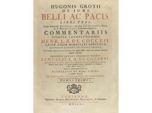 1751. LIBRO. (HISTORIA-MILITARIA). DE JURE BELLI AC PACIS. Lusannae: Sumpt. Marc-Michaelis Bosquet, 1751. 5 vol. en 4º menor. I: Retrato grabado del autor + portada a dos tintas + 2 h. + LXIII p. + 104 + 396 p. II: Portada a dos tintas + 731 p. III: Retrato grabado + portada a dos tintas + 689 p. IV: Portada a dos tintas + 638 p. V: SAMUELIS COCCEII: INTRODUCTIO AD... Id. Portada a dos tintas + XX p. + 703 p. Cinco vol. enc. en pasta española, doble tejuelo, lomera cuajada, cortes pintados, alguna leve peladura en los planos. Grotius es el primer pensador que defiende la idea de un derecho internacional y la autonomía de la razón. Defiende el concepto "guerra justa", que es aquella que no contrasta con la naturaleza del hombre y debe ser regulada por normas internacionales.