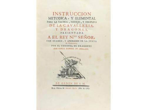 1767. LIBRO. (MILITARIA). INSTRUCCIÓN METODICA, Y ELEMENTAL PARA LA TACTICA, MANEJO, Y DISCIPLINA DE LA CAVALLERIA, Y DRAGONES, PRESENTADA AL REY Ntro. SEÑOR... POR EL CORONEL DE DRAGONES DON... Madrid: Oficina de Antonio Marin, 1767. 4º mayor. 4 h. + XXXV + 382 p. y 18 lám. grabadas y plegadas, fuera de texto. Ilustr. con estados en el texto. Excelente papel de hilo de época. Todas las láminas grabadas por Carmona, también el retrato del rey a modo de cabecera en la dedicatoria. Portada a dos tintas con grabado calcográfico por Joaquín Ballester, que graba también la primera cabecera alegórica. Enc. en plena piel de época, hilos dorados, nervios, tejuelo, lomera cuajada, cortes pintados, conserva la cinta de seda. CCPB 398236-X. Palau 246933. PRIMERA EDICIÓN de esta obra magníficamente impresa. Ramírez de Arellano adopta la nueva táctica prusiana, dejando de lado la francesa, en cuanto al movimiento de la caballería en el campo de batalla, y reintroduce el uso de la lanza.