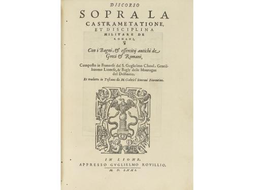 1571. LIBRO. (MILITARIA). DISCORSO SOPRA LA CASTRAMENTATIONE, ET DISCIPLINA MILITARE DE ROMANI. Con i gabni, et essercitii antichi de Greci et Romani. Lione: Apresso Guglielmo Rovillio, 1571. 4º menor. 4 h. + 145 p. + 3 h. Ilustr. con xilografías a plena página en el texto, cabeceras, capitales. Apostillas marginales. Finos taladros marginales. Enc. en pergamino reimbotage, cortes pintados.