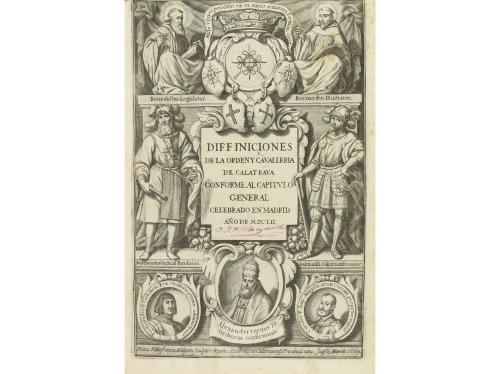 1661. LIBRO. (MILITARIA). DIFINICIONES DE LA ORDEN Y CAVALLERIA DE CALATRAVA CONFORME AL CAPITULO GENERAL CELEBRADO EN MADRID AÑO DE M.DC.LII. Madrid: Impressor del Reyno Diego Diaz de la Carrera, 1661. Folio menor. 12 h. + 675 p. Frontis grabado y retrato de Felipe IV, grabado al cobre por Pedro de Vilafranca con fecha de 1660. Viñetas, capitales y culs-de-lampe. Algo corto de márgenes y leve óxido. Enc. en media piel de finales del s. XIX, corte superior dorado y lomera cuajada. Ex-libris manuscrito de anterior poseedor. Palau 73885.