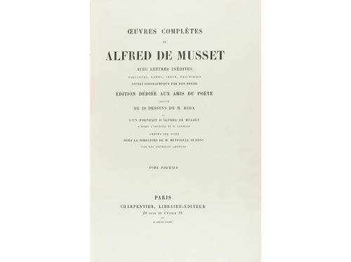 1866. LIBRO. (BIBLIOFILIA-FRANCESA). OEUVRES COMPLÈTES DE... Édition dédiée aux amis du poëte... Paris: Libr.-Éd. Charpentier, 1866. 10 vol. en 4º. I: POÉSIES I. 5 h. + 338 p. + 2 lám. II: POÉSIES II. 4 h. + 342 p. + 6 lám. III: COMÉDIES ET PROVERBES I. 4 h. + 403 p. + 1 h. + 3 lám. IV: COMÉDIES ET PROVERBES II. 4 h. + 363 p. + 3 lám. + 1 h. V: COMÉDIES ET PROVERBES III. 4 h. + 364 p. + 1 h. + 3 lám. VI: NOUVELLES ET CONTES I. 4 h. + 340 p. + 1 h. + 3 lám. VII: NOUVELLES ET CONTES II. 4 h. + 307 p. + 1 h. + 3 lám. VIII: LA CONFESSION D'UN ENFANT DU SIÈCLE. 4 h. + 341 p. + 1 h. + 2 lám. IX: MÉLANGES DE LITTÉRATURE ET DE CRITIQUE. 4 h. + 422 p. + 1 lám. X: OEUVRES POSTHUMES DE ALFRED DE MUSSET. Retrato + 4 h. + 308 p. + 1 h. + 1 lám. + 1 carta facsimilada. Ilustr. con bellas lám. calcográficas y un retrato del artista por M. Bida. Ámplios márgenes. 10 vol. enc. por BRUYÈRE en media piel y puntas, lomera cuajada con alguna mínima rozadura, nervios, corte superior dorado. Conserva las cubiertas originales. Primera edición de las obras completas de MUSSET. Tiraje numerado y nominal sobre papel de hilo verjurado. BNF 30999322.