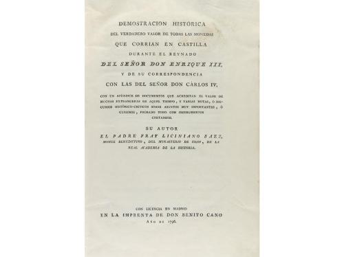 1796. LIBRO. (NUMISMÁTICA). DEMOSTRACION HISTORICA DEL VERDADERO VALOR DE TODAS LAS MONEDAS QUE CORRIAN EN CASTILLA DURANTE EL REYNADO DEL SEÑOR ENRIQUE III Y DE SU CORRESPONDENCIA CON LAS DEL SEÑOR DON CARLOS IV. Madrid: Benito Cano, 1796. 4º mayor. XXXII + 520 p., 1 lám. grabada, 1 tabla plegada. Papel limpio, leve suciedad en la portada. Enc. en pergamino, pérdida en la cabezada superior, lomera cuajada.