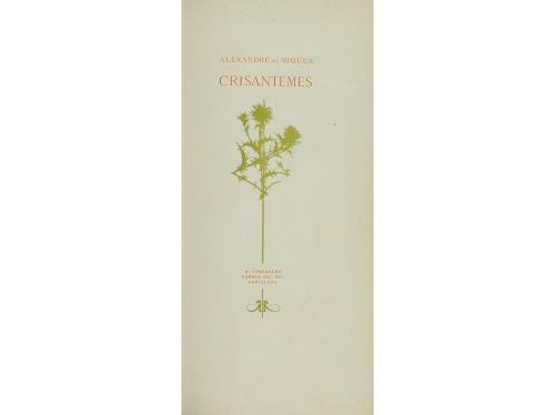 1899. LIBRO. (BIBLIOFILIA-LITERATURA CATALANA). CRISANTEMES. Barcelona: Imp. J. Thomas, 1899. 8º estrecho. 117 p. + 2 lám. cromolitografiadas con sello seco de la imprenta. Profus. ilustr. con viñetas en el texto. Primera edición y con dedicatoria del autor. Enc. firmada por Bueno en media piel y puntas, nervios, corte superior dorado, conserva las cubiertas originales. Uno de los más bellos y delicados ejemplos de las artes gráficas modernistas catalanas. Palau 269364.