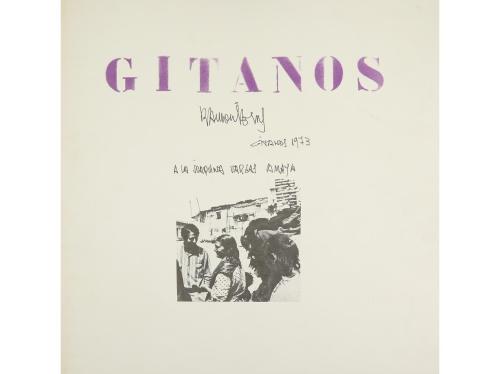 1973. LIBRO. (ARTE). GITANOS. [Barcelona]: Lloret Ind. Gráf., 1944. Folio mayor cuadrado. Contiene la reproducción de 16 dibujos de Ramón Jesús realizados originalmente con bolígrafo, firmado a lápiz por el artista. Edición presentada en rama, en una caja de madera serigrafiada.Tirada numerada de 100 ejemplares.